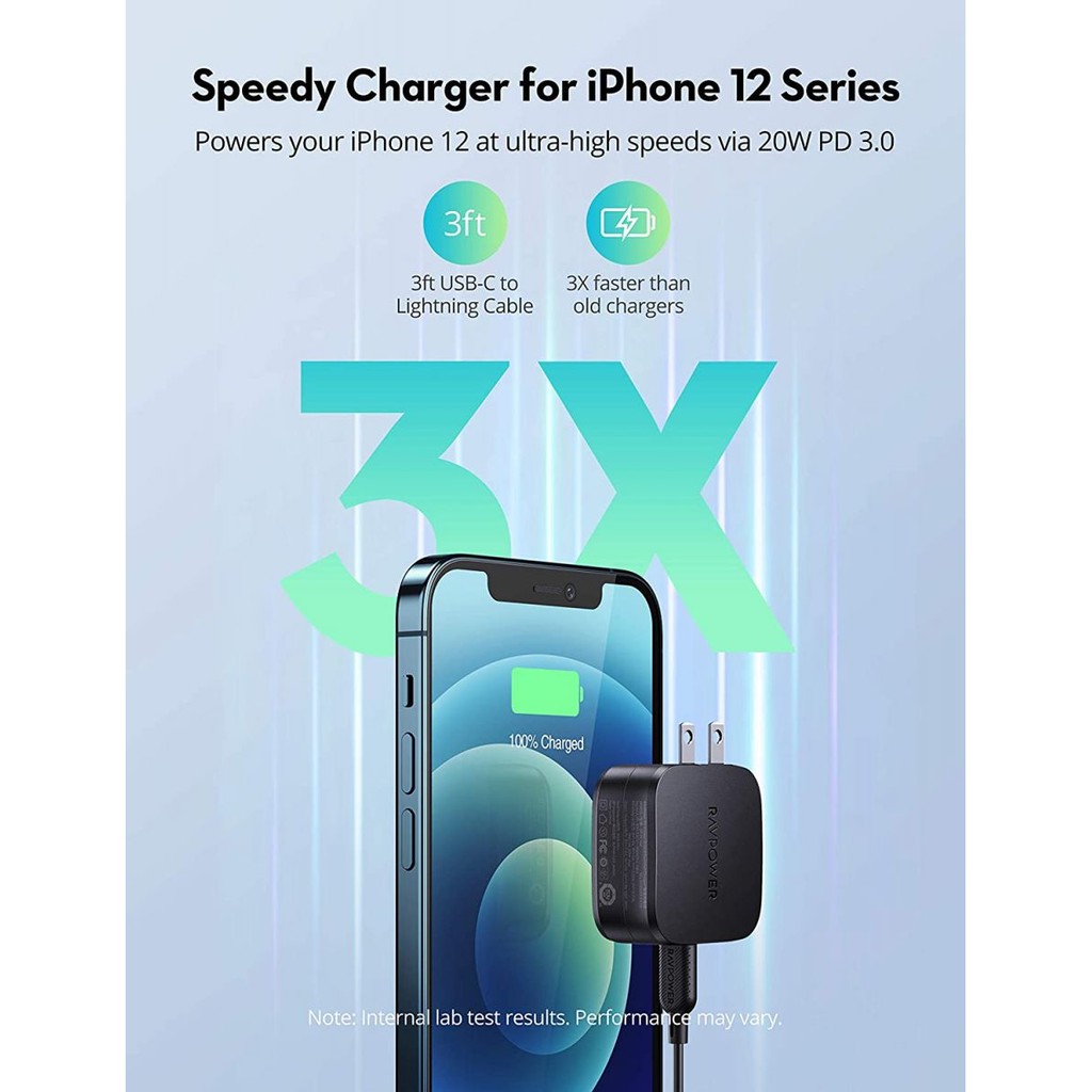 Củ sạc nhanh RAVPOWER RP-PC144 PD 3.0 30W _Sạc nhanh 20W PD 3.0 cho iPhone 12: Tốc độ nhanh chóng mặt để cung cấp năng lượng cho iPhone 12 thông qua cổng đầu ra USB C, hiệu quả từ 0 đến 50% pin chỉ trong 30 phút, giúp bạn tiết kiệm nhiều thời gian _Mạnh mẽ cho hai thiết bị: Sạc đồng thời hai thiết bị bằng đầu ra USB-C 20W và đầu ra USB-A 10W, tổng công suất 30W từ 2 cổng _Cáp được chứng nhận MFi: Đồng bộ hóa dữ liệu liền mạch giữa các thiết bị hoặc kết nối iPhone 12 của bạn bất cứ lúc nào với tốc độ tối đa thông qua cáp Lightning to USB-C cao cấp bền bỉ (dài 3ft) _Phải có đối với Samsung: Tốc độ sạc nhanh hơn (8.2V / 3.1A) so với bộ sạc USB C tiêu chuẩn (9V / 1.63A), bộ sạc nhanh hoàn hảo cho Samsung Galaxy Note 20 / S20 _Hoàn toàn tương thích: Dễ dàng hồi sinh phần lớn điện thoại di động, máy tính bảng, bộ điều khiển chơi game hỗ trợ type-C, bao gồm iPhone 12/11 Pro mới nhất, Galaxy Note 20 / S20, iPad Pro 2018, Switch, v.v. _Bảo vệ An toàn: Sản phẩm được thiết kế kỹ lưỡng giúp bạn và thiết bị của bạn an toàn khỏi quá áp, quá nóng, & đoản mạch; hãy yên tâm mang theo bộ sạc tường nhỏ gọn này (1,93 x 1,93 x 1,18in) với các chân cắm có thể gập lại trong bất kỳ chuyến đi nào