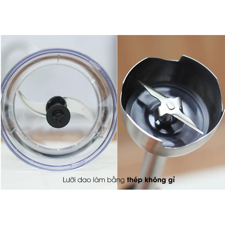 Với thân gắn lưỡi dao bằng inox, bạn có thể dùng xay sinh tố, xay cháo súp… trong cốc xay sinh tố đi kèm hoặc trực tiếp xay trong nồi.