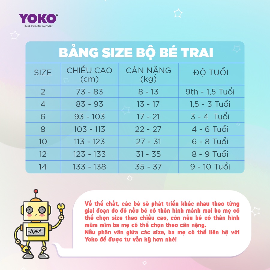 ✏ HƯỚNG DẪN CHỌN SIZE Ba mẹ có thể chọn size cho bé theo bảng size của shop. Về thể chất, các bé sẽ phát triển khác nhau theo từng giai đoạn do đó nếu bé có thân hình gầy cao thì ba mẹ có thể chọn size theo chiều cao, còn nếu bé có thân hình đầy đặn thì ba mẹ có thể chọn theo cân nặng. Sản phẩm của YOKO đã được qua xử lý nên không co rút khi mặc. Nếu phân vân giữa các size, ba mẹ có thể liên hệ với Yoko để được tư vấn kỹ hơn nhé.