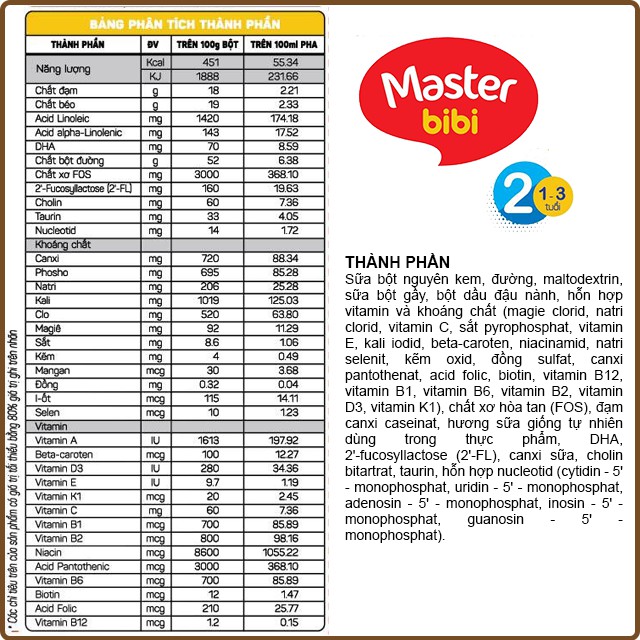 Masterbibi 2 là sản phẩm đặc chế cho sự phát triển toàn diện cả thể chất và trí não của trẻ từ 1-3 tuổi. Masterbibi 2 không những bổ sung cho chế độ ăn hàng ngày, ngăn ngừa suy dinh dưỡng, mà còn giúp trẻ tăng trưởng và phát triển khỏe mạnh, hỗ trợ phát triển xương và chiều cao, giúp phát triển trí não và thị giác, tăng cường sức khỏe đường tiêu hóa.