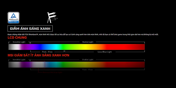 Màn hình MSI G274F công nghệ MSI Anti-Flicker mang đến trải nghiệm xem rất thoải mái bằng cách giảm lượng nhấp nháy được chứng nhận bởi TÜV Rheinland, mang đến trải nghiệm tốt nhất cho bạn khi sử dụng màn hình.