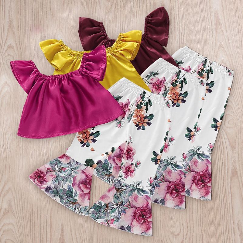 Mary☆ewborn Baby Girls Summer Off Shoulder Tops + Flared Floral Pants Outfits Set