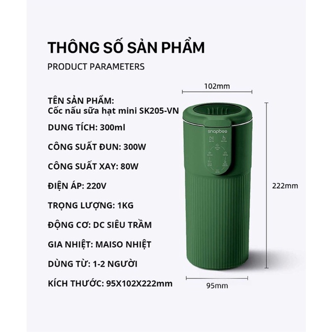 Máy nấu sữa hạt mini SnapBee được ví như một chiếc cối ma thuật tuy nhỏ gọn nhưng rất mạnh mẽ và đa năng. Thiết kế được trau chuốt phù hợp với mọi không gian của bạn tại nhà, du lịch, văn phòng … Sản phẩm sử dụng 100% chất liệu cao cấp và an toàn với người sử dụng. Bên cạnh chất lượng vượt trội thì Máy nấu sữa hạt mini SnapBee còn có chế độ hậu mãi khủng: có quà kèm theo khi mua máy, sản phẩm được bảo hành đổi mới trong vòng 12 tháng, đội ngũ hổ trợ nhiệt tình và chu đáo. SnapBee sẽ không làm bạn thất vọng. ➡️ Thiết kế nhỏ gọn, gam màu xinh xắn. ➡️ Tiết kiệm thời gian, năng lượng tiêu thụ ➡️ Chức năng cải tiến vượt trội: Nấu sữa, nấu cháo, xay sinh tố,.. ➡️ Tự vệ sinh sạch sẽ, an toàn khi sử dụng ➡️ Giá thành hợp lý