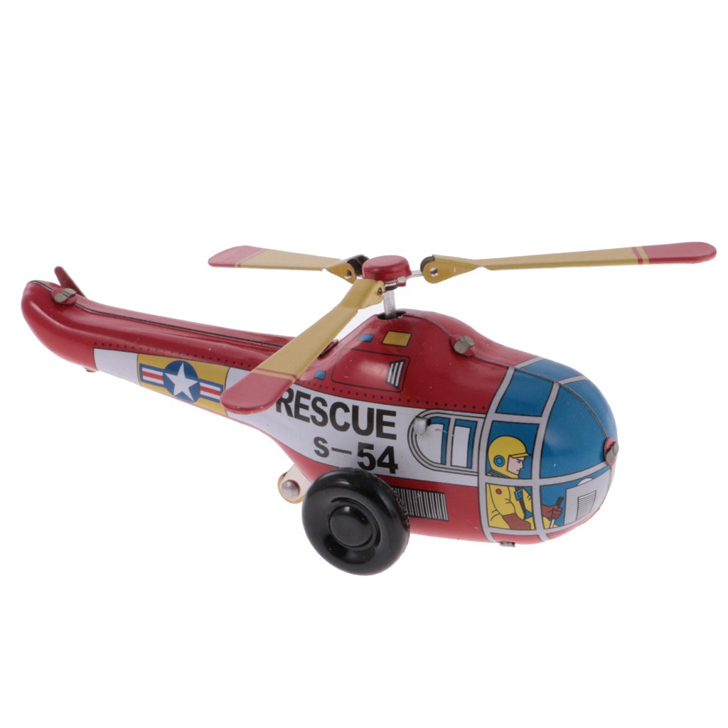 Vintage helicopter aircraft model clockwork wind up tin toy collectible gift Wind it up with the key, the helicopter will ahead with rotating wing A perfect decorative ornament for adult collection Size(L*W*H): Approx.12*10*5.5cm / 4.72*3.93*2.16inch Color: Red Material: Tin Warning: This item contain sharp parts, kids should be under adult's supervision when playing this toy.