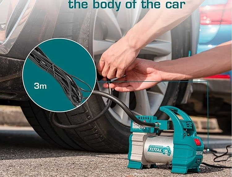 Máy bơm lốp, bánh xe đa năng nguồn 12v có cáp nối bình TOTAL TTAC1406 có dây cáp dài đến 3m, cùng với cáp kết nối bình giúp lấy nguồn sạc từ bình điện acquy một cách dễ dàng.