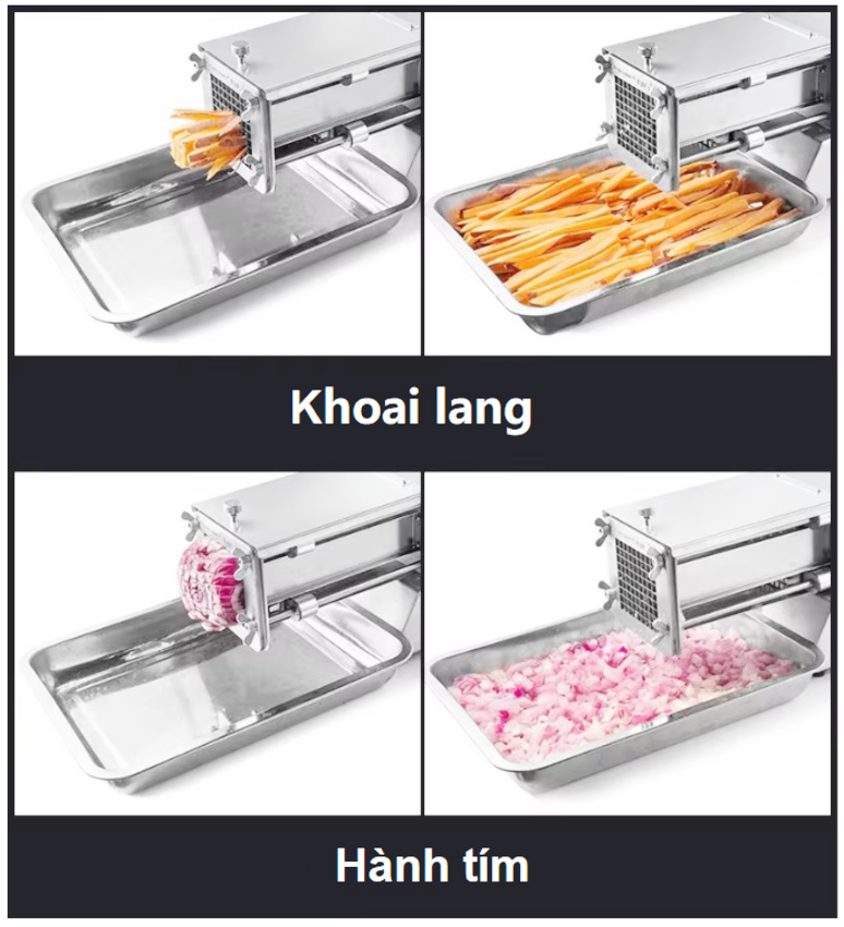 - Kinh doanh khoai chiên cùng với các món đồ ăn vặt, gà rán tuy không phải là mới nhưng chưa bao giờ bị bão hòa, ngược lại còn đem đến thu nhập cao bởi đây vẫn là món ăn vặt khoái khẩu, thơm ngon, hấp dẫn của giới trẻ. Để giúp công đoạn cắt khoai tại các cơ sở kinh doanh trở nên nhanh gọn, tiết kiệm thời gian, công sức. Giới thiệu máy cắt khoai tây, khoai lang và các loại củ kiểu Pháp chuyên nghiệp Septree T1000. Sản phẩm dùng để cắt khoai tây, khoai lang, cà rốt, su hào, dưa chuột…thành sợi vuông sợi dài, năng suất đạt từ 216– 250kg/ giờ.