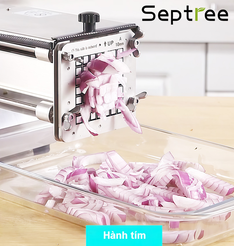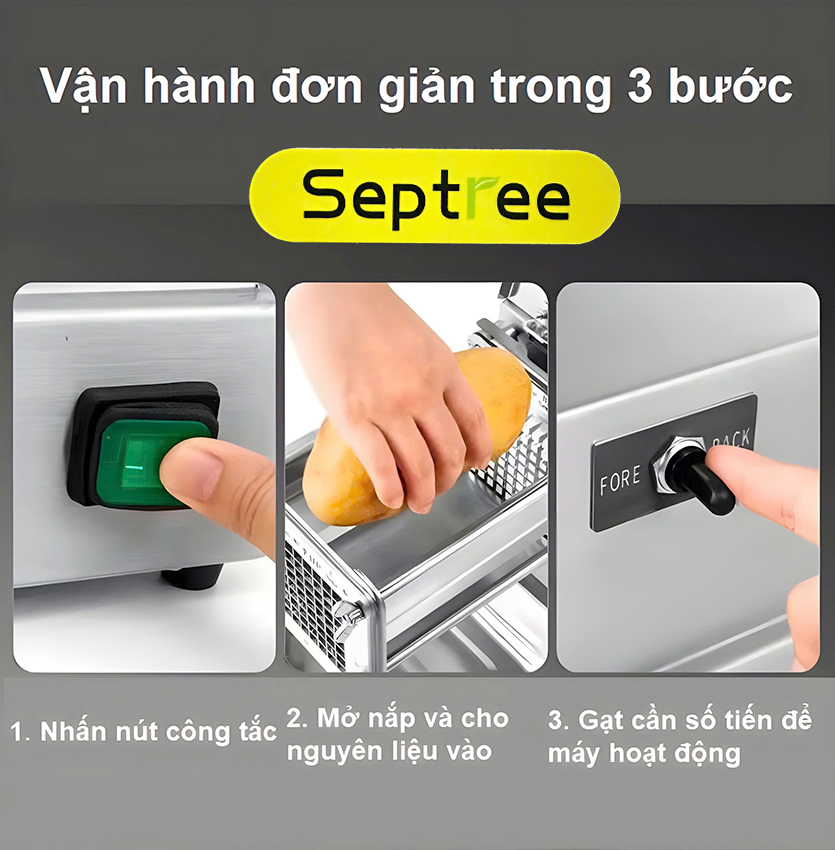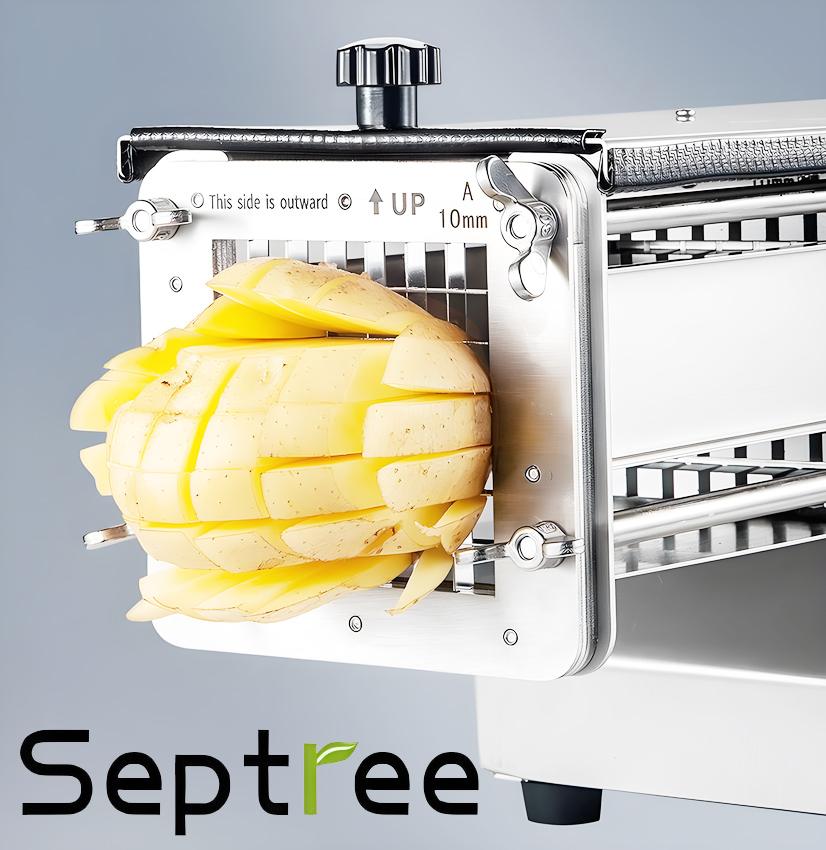 - Máy cắt rau củ Septree T1000 có chức năng cắt vuông nhiều loại củ quả như khoai lang, khoai tây, củ cải, cà rốt, su hào, dưa chuột… một cách nhanh chóng và đồng đều. Máy cắt khoai lang chiên thích hợp sử dụng trong các quầy đồ ăn nhanh, quán ăn vặt, KFC, quán cafe, nhà hàng, khách sạn hay các hộ kinh doanh nhỏ lẻ