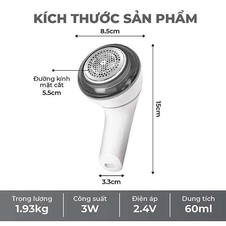 - Máy cắt vải thừa Khoang chứa lớn 60ml, dễ tháo rời và vệ sinh.