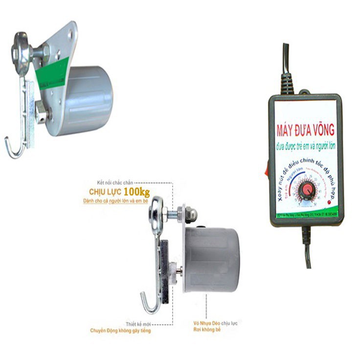 Đặt motor phía sau giá võng sử dụng 2 bù lon U (được gởi kèm theo máy) từ phía trước giá võng xuyên qua 2 lỗ đục sẵn trên bản sắt của motor sau đó dùng tán chuồn khóa chặc motor vào giá võng, đồng thời móc lưới võng vào móc của máy đưa võng 2. Gắn Adapter và điều chỉnh tốc độ Cắm đầu DC vào giắc DC và cắm dây điện vào ổ điện. Lúc này đèn led trên adapter sẽ phát sáng. Xoay nút vặn trên adapter để điều chỉnh tốc độ đưa phù hợp. Đối với trẻ em thông thường từ số 2 đến số 9 và người lớn từ số 10 đ