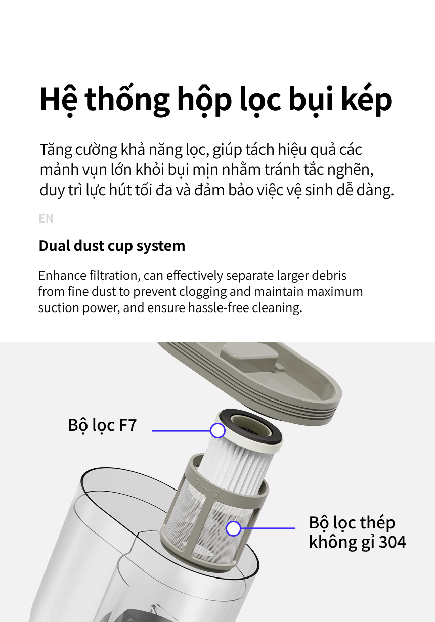 HỆ THỐNG HỘP LỌC BỤI KÉP: Tăng cường khả năng lọc, giúp tách hiệu quả các mảnh vụn lớn khỏi bụi mịn nhằm tránh tắc nghẽn, duy trì lực hút tối đa và đảm bảo việc vệ sinh dễ dàng.