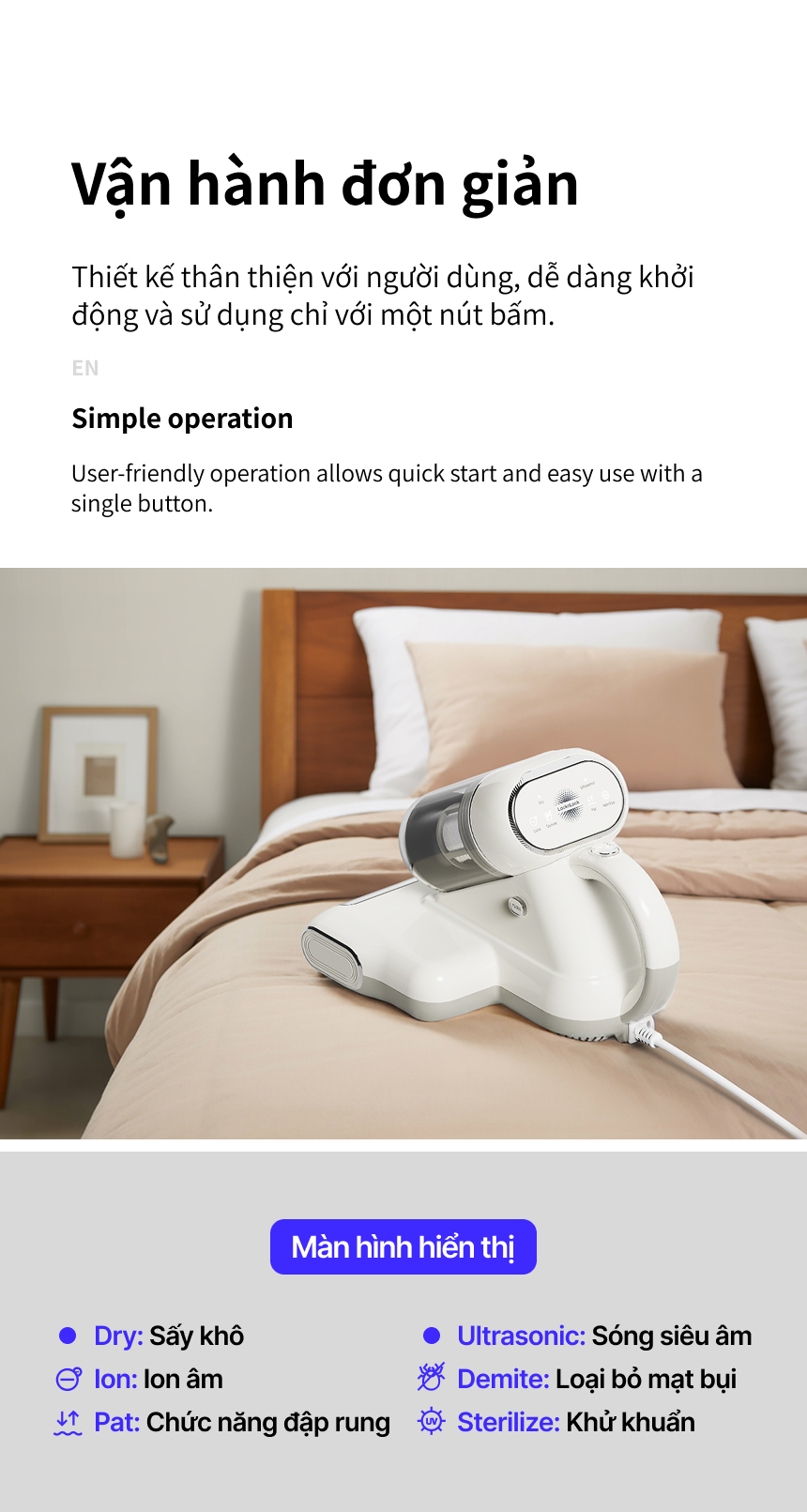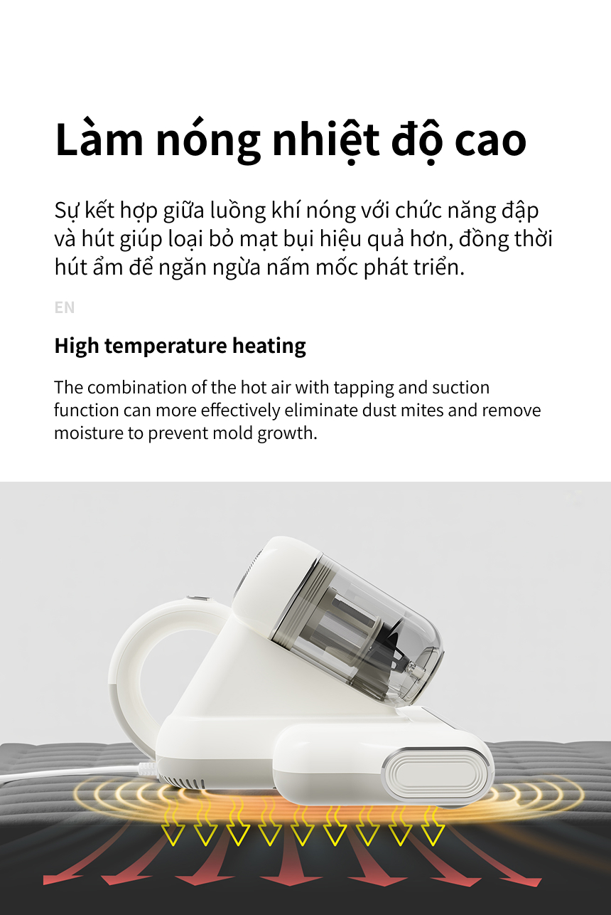 LÀM NÓNG NHIỆT ĐỘ CAO: Sự kết hợp giữa luồng khí nóng với chức năng đập và hút giúp loại bỏ mạt bụi hiệu quả hơn, đồng thời hút ẩm để ngăn ngừa nấm mốc phát triển.
