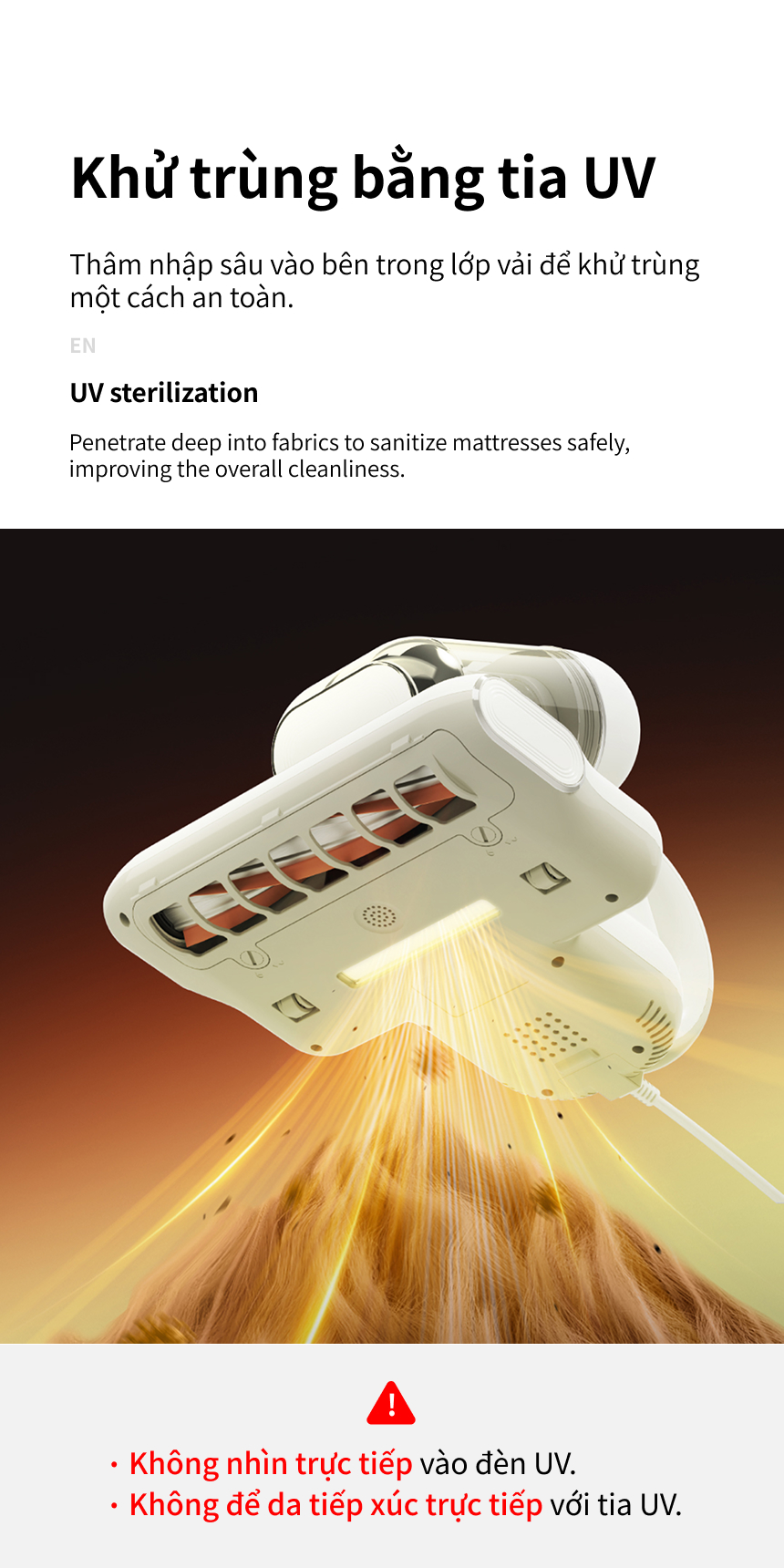 KHỬ TRÙNG BẰNG TIA UV: Thâm nhập sâu vào bên trong lớp vải để khử trùng một cách an toàn.