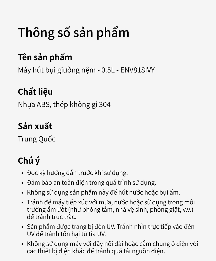 - Sản phẩm được trang bị đèn UV. Tránh nhìn trực tiếp vào đèn UV để tránh tổn hại từ tia UV.