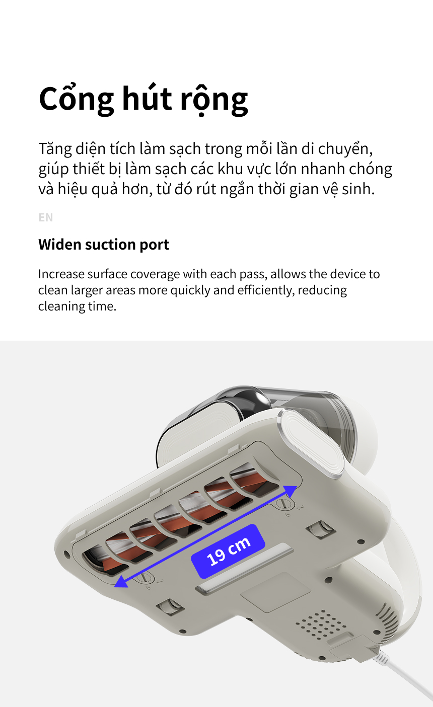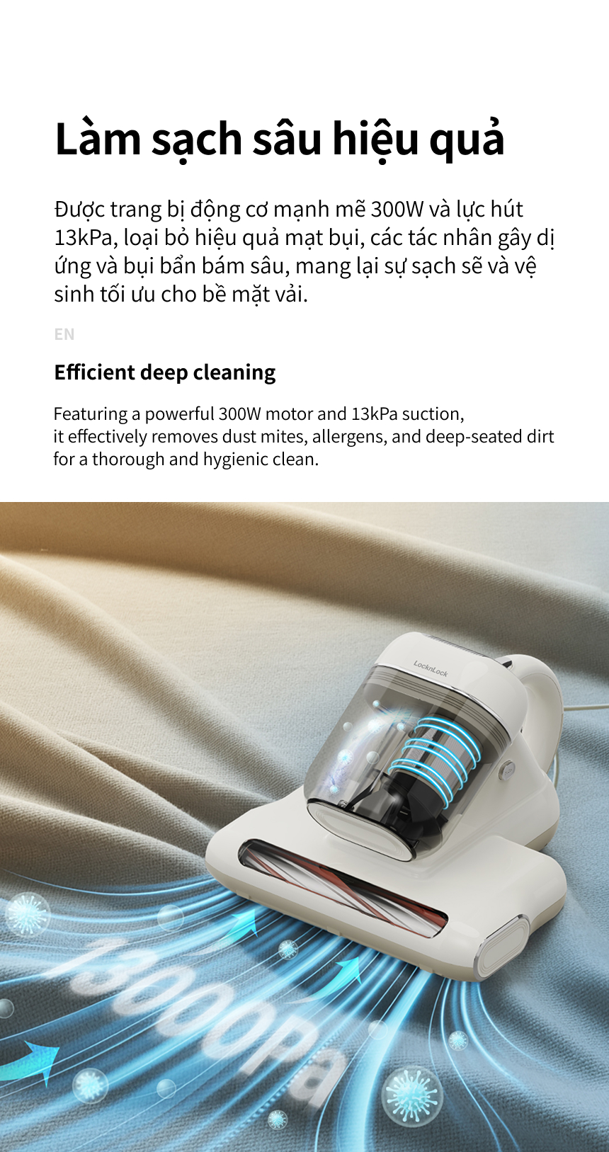 LÀM SẠCH SÂU HIỆU QUẢ: Được trang bị động cơ mạnh mẽ 300W và lực hút 13kPa, máy hút bụi giường nệm loại bỏ hiệu quả mạt bụi, các tác nhân gây dị ứng và bụi bẩn bám sâu, mang lại sự sạch sẽ và vệ sinh tối ưu cho bề mặt vải.
