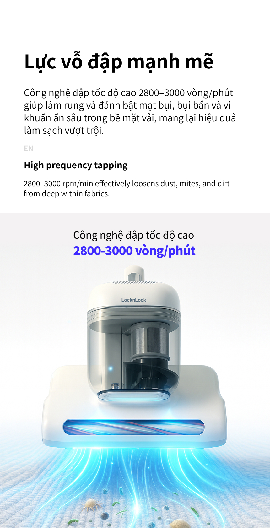LỰC VỖ ĐẬP MẠNH MẼ: Công nghệ đập tốc độ cao 2800–3000 vòng/phút giúp làm rung và đánh bật mạt bụi, bụi bẩn và vi khuẩn ẩn sâu trong bề mặt vải, mang lại hiệu quả làm sạch vượt trội.