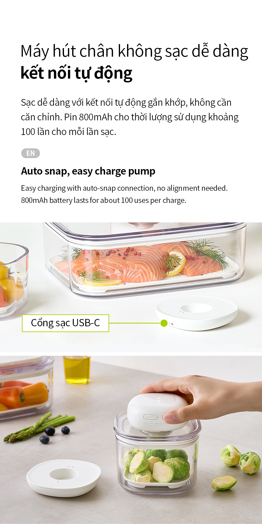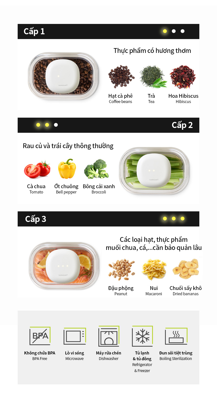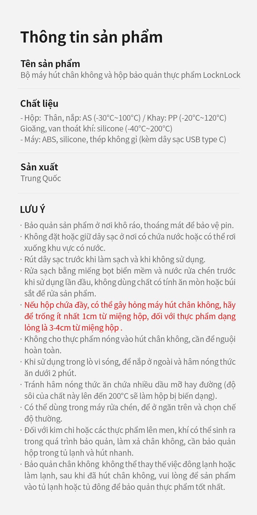 7. Đối với kim chi hoặc các thực phẩm lên men, khí có thể sinh ra trong quá trình bảo quản, làm xả chân không, cần bảo quản hộp trong tủ lạnh và hút nhanh.