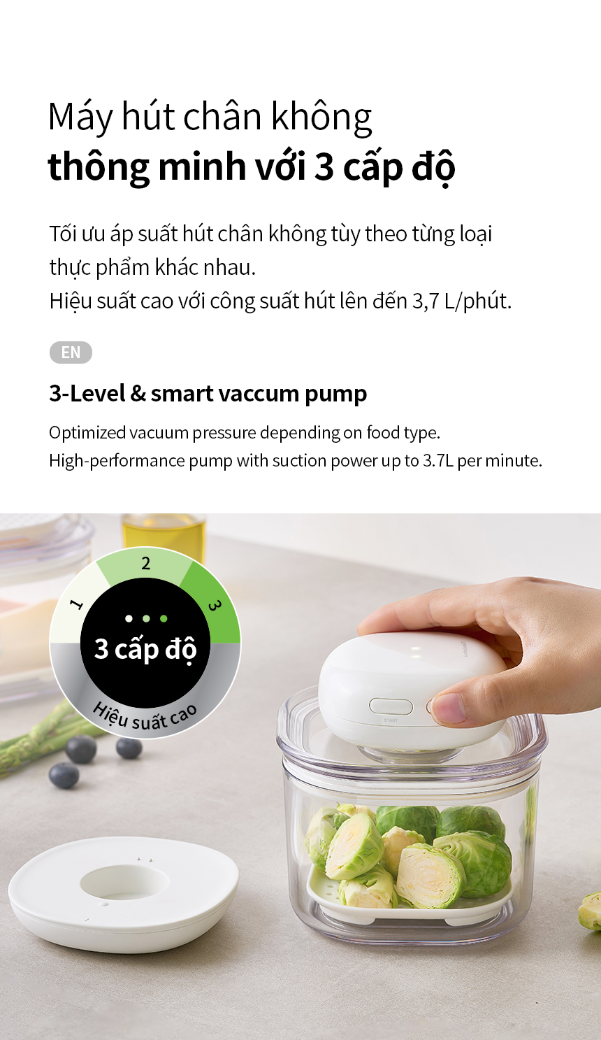 - MÁY HÚT CHÂN KHÔNG THÔNG MINH VỚI 3 CẤP ĐỘ: Tối ưu áp suất hút chân không tùy theo từng loại thực phẩm khác nhau. Hiệu suất cao với công suất hút lên đến 3,7 L/phút.