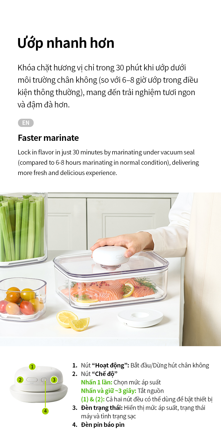 - ƯỚP NHANH HƠN: Khóa chặt hương vị chỉ trong 30 phút khi ướp dưới môi trường chân không (so với 6–8 giờ ướp trong điều kiện thông thường), mang đến trải nghiệm tươi ngon và đậm đà hơn.