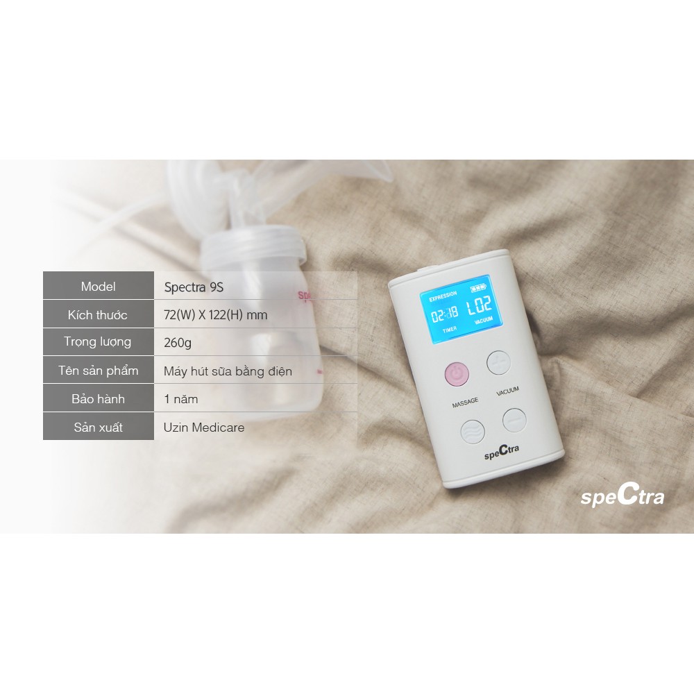Tính năng nổi bật Spectra 9S: - Công nghệ hút 2 giai đoạn tái tạo gần như thật quá trình bú của trẻ. Gồm 2 chế độ hút là chế độ "Massage kích thích" và chế độ "ra sữa". - Hút 2 bên (hút đôi) - Dùng điện hoặc pin AA - Màn hình LCD hiển thị các chế độ hút và thời gian hút. - Nhẹ nhàng và êm ái khi hút sữa.. - Điều chỉnh áp lực hút một cách dễ dàng với 10 cấp độ, chế độ Massage 5 cấp độ. - Thiết kế nhỏ gọn. Spectra 9S được thiết kế riêng cho các bà mẹ, sao cho máy có thể cầm dễ dàng trong lòng bàn tay. - Đảm bảo an toàn cho Baby nhà sản xuất đã ứng dụng công nghệ sản xuất bình sữa, phễu hút, ống khí và các đồ nhựa khác trên máy hoàn toàn là nhựa không độc, không nhiễm chất Bisphenol A(BPA free). Các bà mẹ dễ dàng mang theo khi đi làm hoặc đi du lịch.