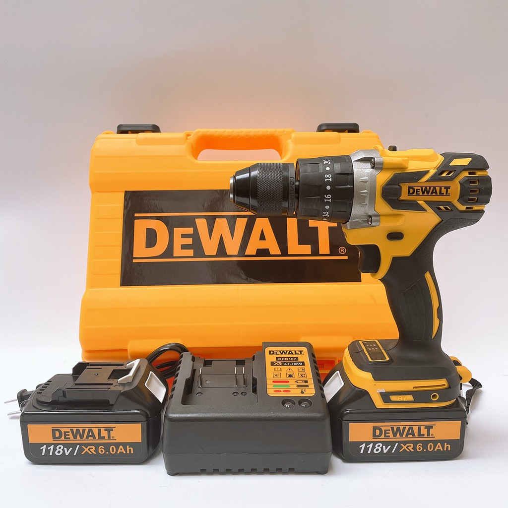 * THÔNG TIN SẢN PHẨM: MÁY KHOAN PIN DEWALT 118V - Pin : 2 pin Li-ion 118V 6Ah - Điện thế pin 20-21V chuẩn 10 Cell - Sạc tiêu chuẩn có đèn báo tự ngắt khi đầy - Lực vặn tối đa cứng/mềm: 42/24Nm - Tốc độ quay: 3200v/p - Tốc độ không tải: 350v/p - Chế độ AutoLock, 100% lõi đồng, không chổi than - Đầu kẹp mũi khoan: 13mm - Hai tốc độ khoan, 3 chức năng: khoan, vít, búa - Đèn led theo máy soi vùng tối khi khoan - Thời lượng 1 pin khi sử dụng liên tục: 2.5-3h - Thiết kế nhỏ gọn, tay cầm được bọc cao su chống trơn trượt - Bộ sản phẩm bao gồm: 1 máy, 2 pin, 1 sạc, 1 hộp nhựa, 1 mũi khoan, 1 mũi vít - Kích thước: 239mm x 83mm x 240mm