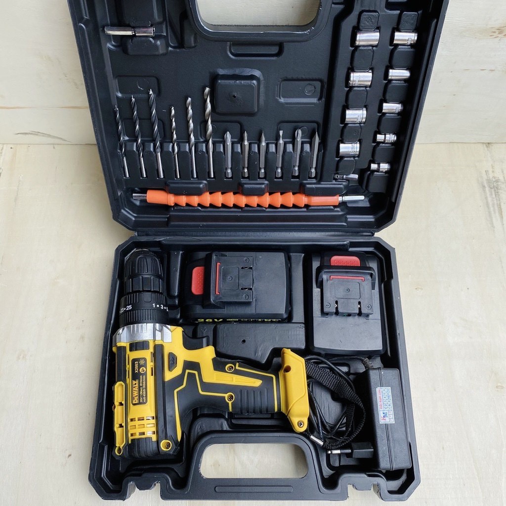 MÁY KHOAN PIN Dewalt 26V Có Búa Tặng BỘ PHỤ KIỆN 24 CHI TIẾT ------------------------------------------------------------------ THÔNG SỐ KỸ THUẬT : • Tên sản phẩm: Máy khoan pin 26V hiệu DeWALT • Nguồn: 2 pin 26V Li-ion 2000mAh • Mô men xoắn cực đại :32Nm • Tốc độ không tải : 0-650v/phút ở tốc độ 2, 0-2200v/phút ở tốc độ 1 • Đầu cặp nhanh :10mm • Trọng lượng máy :1.5kg • Chức năng : khoan tường, khoan sắt, khoan gỗ, khoan vít tôn, bắt vít… BỘ SẢN PHẨM BAO GỒM: + 1 máy khoan pin + 1 sạc + 1 hoặc 2 Pin Lithium- ion + 1 Hộp đựng + 1 bộ phụ kiện. ----------------------------------------------------------------- CHỨC NĂNG: + Máy khoan pin Dewalt 26v được trang bị động cơ cực khỏe đặc biệt có chế độ khoan búa nên có thể khoan mọi bề mặt: khoan gỗ, khoan tường, khoan bê tông, khoan kim loại,... + DUNG LƯỢNG PIN CỰC KHỦNG: Pin của máy khoan pin Dewalt 26v được cải tiến với công nghệ sạc nhanh, và cải thiện được thời gian sử dụng lên nhiều giờ đồng hồ. Bên cạnh đó sản phẩm được TẶNG KÈM 1 viên pin dự phòng==>> Không còn nỗi lo về thời gian sử dụng. + THIẾT KẾ PHÙ HỢP: Thân máy khoan pin dewalt 26v được làm từ chất liệu cao cấp, đầu khoan bọc thép ==>> kéo dài độ bền, cũng như hạn chế va chạm đến động cơ máy khoan bên trong. Vỏ ngoài máy được làm bằng nhựa và tay cầm được bọc một lớp cao su tạo độ nhám cao giúp chống trượt, chịu nhiệt và cách điện. Thiết kế này vừa tạo cảm giác chắc chắn, êm tay, vừa đảm bảo an toàn cho bạn kể cả khi bị ra mồ hôi tay hay tay bạn đang bị dính dầu nhớt trong lúc làm việc. ------------------------------------------------------------------ Cam kết của Shop: ✔️ Hàng chuẩn như hình ✔️ Mọi chức năng Shop tư vấn đều chính xác dựa trên thực tế và phản hồi của khách hàng ✔️ Bảo hành 6 tháng. Đổi mới miễn phí với tất cả sản phẩm bị lỗi trong vòng 7 ngày đầu tiên ------------------------------------------------------------------