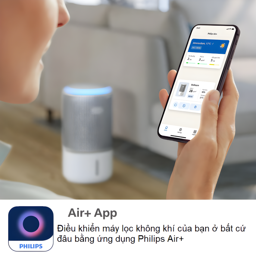 - Ghép nối máy lọc không khí với ứng dụng Air+ để theo dõi chất lượng không khí trong nhà và ngoài trời, điều khiển từ xa và ra lệnh bằng giọng nói qua Google và Alexa. Trong ứng dụng, hãy chọn chế độ Auto+ để công nghệ AI thích ứng với thói quen của bạn đồng thời giảm thiểu tiếng ồn và mức sử dụng năng lượng.