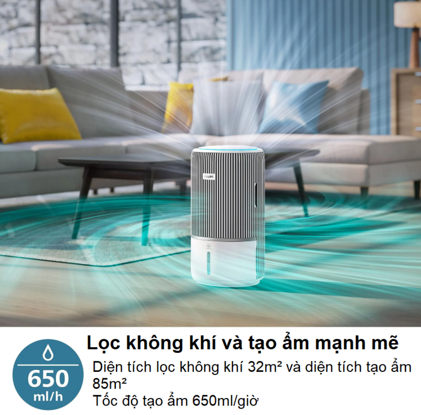 - Chống lại các triệu chứng khô da, nứt nẻ môi, kích ứng mũi hoặc họng với khả năng tạo độ ẩm nhanh lên đến 655 ml/giờ. Độ ẩm được phát hiện và tự động điều chỉnh theo cài đặt mong muốn.