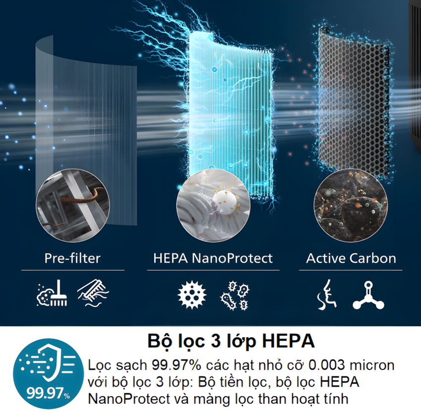 Lọc HEPA 3 lớp giữ lại 99,97% các hạt nhỏ nhất