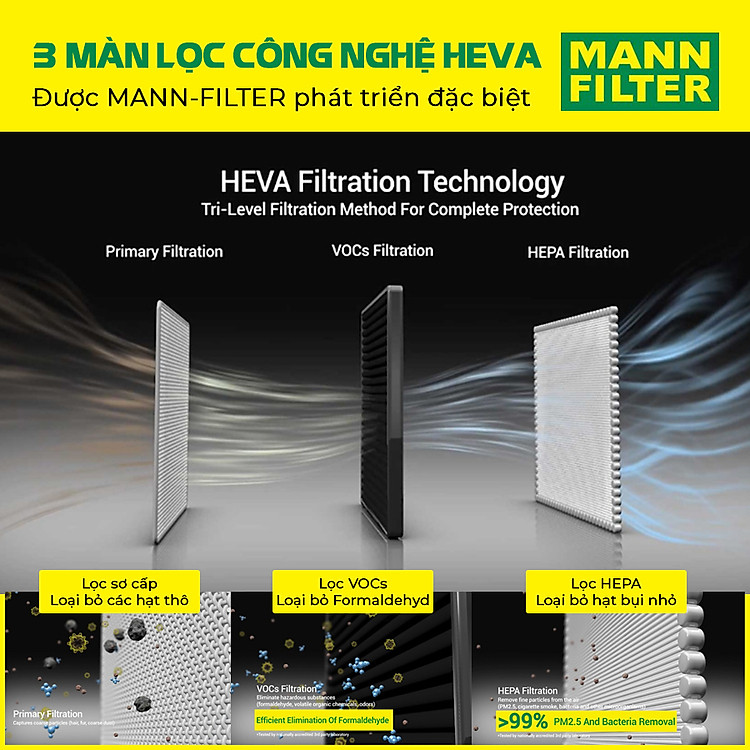 ● Công nghệ lọc HEVA của Máy lọc không khí ô tô MANN-FILTER là một công nghệ tiên tiến được MANN-FILTER phát triển đặc biệt.