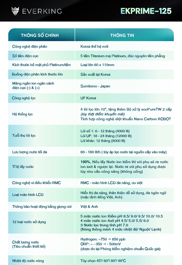 EVERKING EKPrime-125 được trang bị công nghệ tiên tiến, với hàng loạt chức năng tiện ích hơn hẳn các dòng máy truyền thống trên thị trường, tạo ra được nhiều mức pH nhất so với các dòng cùng tấm điện cực, đáp ứng mọi nhu cầu sử dụng nước và cho trải nghiệm công nghệ vượt bậc, nâng cao chất lượng sống.