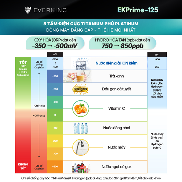 EVERKING là dòng máy duy nhất có khả năng cung cấp nhiều loại nước điện giải nhất hiện nay so với loại cùng tấm điện cực, EKPrime-125 tạo đến 12 loại nước chức năng, phục vụ mọi nhu cầu sinh hoạt, gồm: