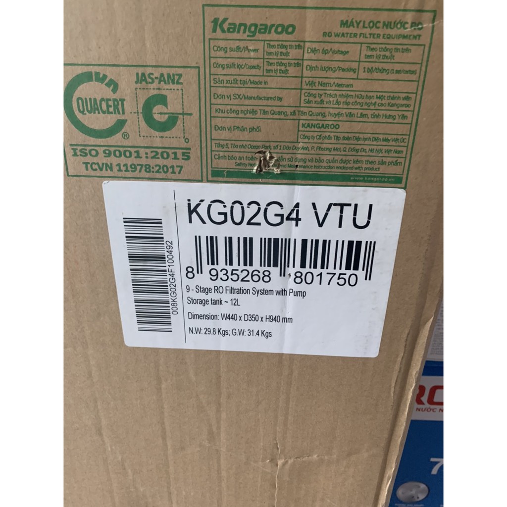 + Loại bỏ tạp chất vi khuẩn kích thước siêu nhỏ đến 103 micron + Loại bỏ Amip ăn não người, chủng vi khuẩn tồn tại trong nước rất khó tiêu diệt. + Loại bỏ Asen, loại bỏ độc tố chết người thường có trong nước sinh hoạt. + Hỗ trợ và tăng cường sức khỏe nhờ cơ chế bổ sung khoáng chất, cân bằng PH và điện giải trong cơ thể. + Tạo nước giàu khoáng chất có lợi cho sức khỏe, an toàn khi uống trực tiếp. KẾT HỢP HOÀN HẢO CỦA CÁC LÕI LỌC THÔNG MINH, TẠO NƯỚC UỐNG GIÀU KHOÁNG - Lõi Negative Ion( lõi lọc mới số 3) khử kim loại nặng: Fe+, Ca2+, Mg2+,... loại bỏ hoàn toàn đá vôi, làm mềm nước cứng, bảo vệ và tăng tuổi thọ màng RO, giúp tiết kiệm chi phí tối đa, nguồn nước uống sạch, an toàn và tinh khiết nhất để uống trực tiếp. - Lõi Maifan trong máy lọc nước Kangaroo có chức năng tạo nước giàu khoáng chất, nguồn nước được bổ sung vị ngon, ngọt, khá là mềm khi uống trực tiếp. - Lõi lọc ORP OMEGA+: Chống oxi hóa, loại bỏ hiệu quả chất gây lão hóa, kéo dài tuổi thanh xuân, hỗ trợ điều trị bệnh mãn tính: mỡ máu, tiểu đường, huyết áp... Máy lọc nước Kangaroo OMEGA+ KG02G4 (Vỏ hoa Hàn Quốc) HIỆU SUẤT LỚN, HOẠT ĐỘNG MẠNH MẼ, BÌNH CHỨA LỚN Máy có công suất lọc khoảng từ 10-15 lít/h, hoạt động mạnh mẽ cho hiệu quả lọc nước sạch cao, có thể đáp ứng yêu cầu sử dụng nước nhiều trong gia đình, trường hợp, bệnh viện, đặc biệt dung tích bình hứa lớn, đựng được tối đa đến 20 lít nước cho một lần lọc. BƠM HÚT TỰ ĐỘNG, TIẾT KIỆM ĐIỆN NĂNG VÀ CHI PHÍ Máy lọc nước Kangaroo OMEGA+ KG02G4 tự động bơm hút nước khi hết, tự động ngắt khi bình áp đầy, hoạt động kể cả trong điều kiện nguồn nước có áp lực yếu. LẤY NƯỚC DỄ DÀNG VỚI VÒI NƯỚC INOX SÁNG BÓNG Máy lọc nước Kangaroo OMEGA+ KG02G4 (Vỏ hoa Hàn Quốc)