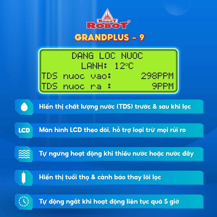 Máy lọc nước Nóng thông minh – Nguội – Lạnh ROBOT GrandPlus-9 được tích hợp công nghệ “Bảo vệ 3 tầng” gồm 2 màng lọc UF + R.O & vi điều khiển RMC/LCD, đảm bảo nguồn nước lọc tối ưu cho gia đình: