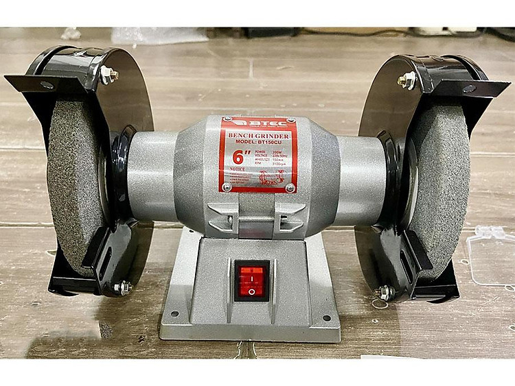 Máy mài hai đá Btec BT150CU là loại máy mài dụng cụ cầm tay công suất 200W, sử dụng mô tơ dây đồng bền bỉ, tốc độ quay khoảng 3100 vòng/phút, có hai đá mài (một mịn, một thô) cho các công việc như mài dao, mũi khoan, kéo, dụng cụ cắt gọt; trang bị tấm chắn bảo vệ, chân đế chống rung, vận hành êm ái, phù hợp cho xưởng cơ khí nhỏ, thợ thủ công. Thông tin tổng quan: Model: Btec BT150CU. Công suất: 200W (tương đối thấp, phù hợp công việc nhẹ). Loại mô tơ: Dây đồng 100% (tăng độ bền và tuổi thọ). Tốc độ: Khoảng 3.100 vòng/phút (vừa phải, an toàn). Đá mài: 2 đá (thường 1 đá mịn, 1 đá thô) cho nhiều mục đích. Ứng dụng: Mài sắc dao, mũi khoan, kéo, dụng cụ cơ khí nhỏ, gia công kim loại nhẹ. Tính năng: Thiết kế chắc chắn, có chân đế chống trượt, giảm rung lắc. Có tấm chắn bảo vệ (bảo vệ mắt và mặt người dùng). Hoạt động êm ái, độ ồn thấp. Ưu điểm: Giá thành hợp lý (thường dưới 1 triệu VNĐ). Nhỏ gọn, dễ sử dụng cho nhiều công việc cơ bản. Mô tơ đồng bền bỉ. Nhược điểm: Công suất nhỏ, không phù hợp cho các công việc đòi hỏi cường độ cao, thời gian dài. Tóm lại: Máy mài hai đá Btec BT150CU là lựa chọn tốt cho gia đình, xưởng nhỏ, thợ thủ công cần một máy mài đa năng, giá rẻ và bền bỉ cho các công việc mài giũa thông thường.