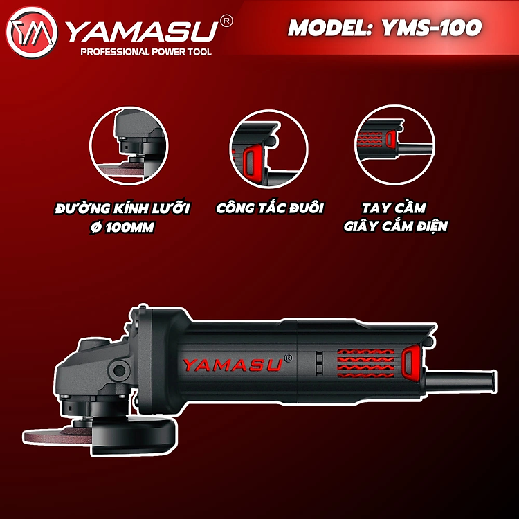 Tay cầm của máy Yamasu YMS-100 được thiết kế vừa tay người dùng, độ ma sát cao giúp chống trượt ngay cả khi tay bị dính dầu nhớt hoặc bị ra mồ hôi, góp phần giảm thiểu tối đa nguy cơ xảy ra tai nạn trong khi làm việc. Phần thân còn có khe tản nhiệt, nhằm giảm bớt nhiệt độ khi hoạt động trong thời gian dài, hạn chế nóng máy, giữ cho tuổi thọ được lâu hơn.