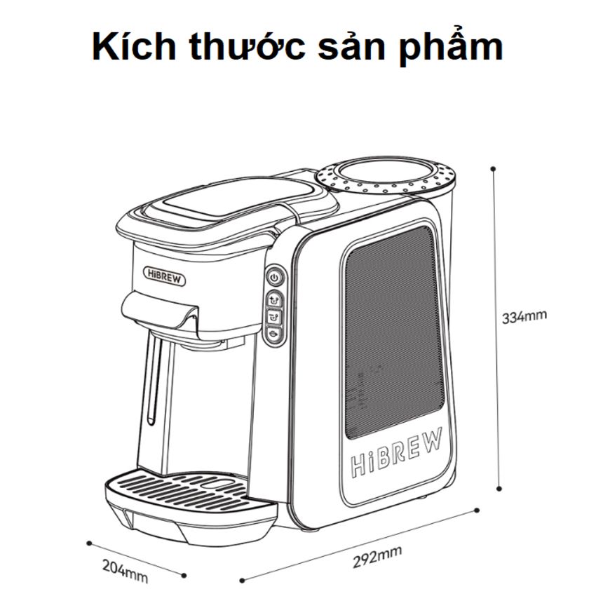* Thông số kỹ thuật sản phẩm: - Thương hiệu: HiBREW (USA - MỸ) - Nhà máy sản xuất đặt tại: Trung Quốc - Mã hàng: H6 - Chức năng pha cà phê: Espresso, Viên Nén Nespresso, Nescafe Dolcegusto, Kcup - Dung tích bình chứa nước: 1.4 Lít - Áp suất bơm: 20 bar - Công suất: 1450W - Màn hình LCD sắc nét, dễ dàng điều chỉnh - Nhiệt độ cà đặt: Lạnh 25℃, Nóng 80℃ - 95℃ - Chất liệu vỏ: Nhựa Tritan free BPA và ABS cao cấp - Nguồn điện áp: 220V - 240V / 50Hz-60Hz - Kích thước: 204*292*334mm - Trọng lượng: 4kg