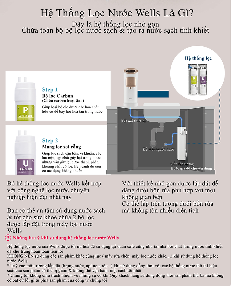 Hệ thống lọc nước Wells kết hợp với công nghệ lọc nước chuyên nghiệp và hiện đại nhất ngày nay. Bạn hoàn toàn an tâm khi sử dụng nguồn nước sạch với 2 bước lọc: