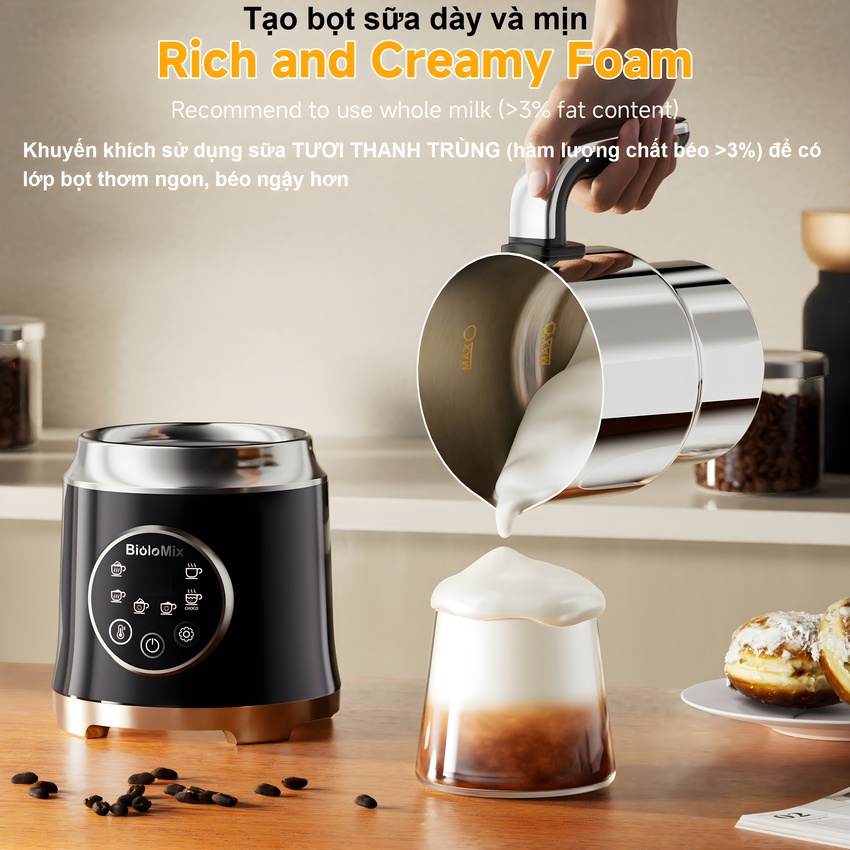 - Máy tạo bọt sữa nóng và lạnh 4 trong 1 Biolomix BMF101 được thiết kế với kiểu dáng sang trọng, độc đáo và cao cấp. Máy có thể tạo bọt sữa nóng, lạnh cho cappuccino, đồng thời làm nóng sữa để pha latte...