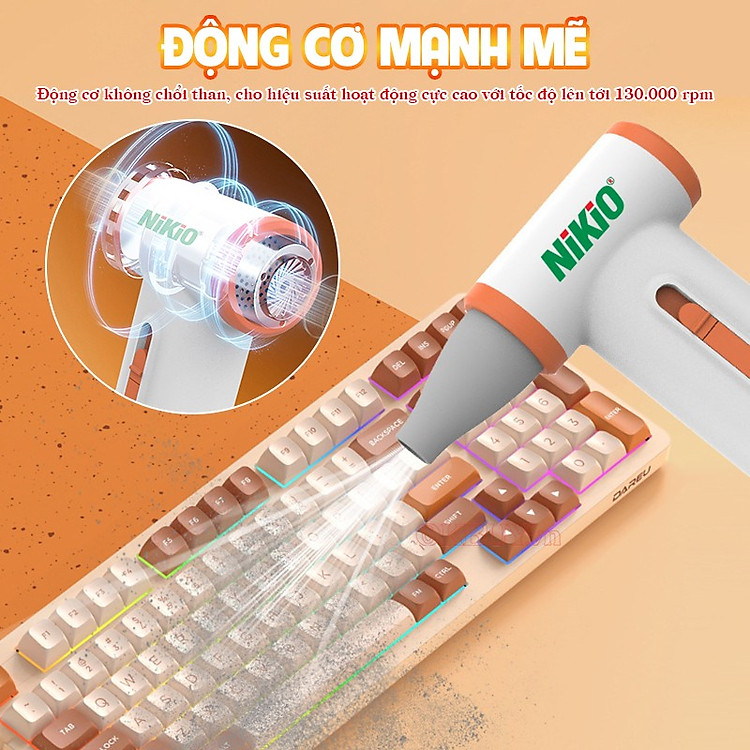 Máy thổi bụi cầm tay mini pin sạc Nikio ST-805B sử dụng động cơ không chổi than, cho hiệu suất hoạt động cực cao với tốc độ lên tới 130.000 rpm. Nhờ đó, máy tạo ra luồng gió cực mạnh, dễ dàng thổi sạch bụi bẩn, lá cây, tóc rối, lông thú cưng, vụn thức ăn hay các vật thể nhỏ ở những nơi khó tiếp cận như góc tủ, bàn phím máy tính, khe tủ lạnh, điều hòa…