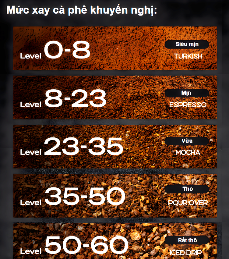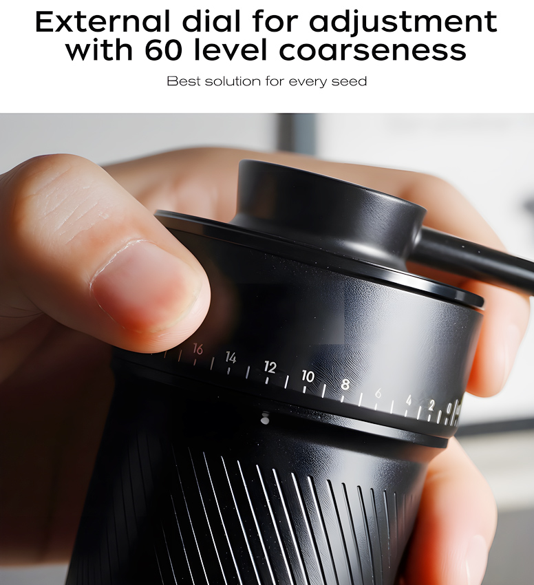 * Ưu điểm nổi bật: - Nhỏ gọn, tiện dụng khi sử dụng xay bằng Pin hoặc quay tay tuỳ thích. Đa năng cho mọi nhu cầu sử dụng khắp mọi nơi - Không tốn sức khi dùng: An toàn trong sử dụng kể cả với người lớn hay thiếu niên vì chỉ một nút bấm là cà phê nhanh chóng được nghiền trong thân máy. - Lưỡi dao thế hệ 6 hình nón: Đường kính đĩa xay 40mm, kết cấu 10 rãnh răng cắt cà phê. Tốc độ nghiền nhanh, tỷ lệ đồng đều cao. Tập trung hỗ trợ tốt nhất cho espresso. - Phạm vi xay rộng, biên độ điều chỉnh chính xác 0,025mm: Dễ dàng cài đặt độ xay hoàn hảo cho turkish, espresso. Các phương pháp pha như Frenchpress hoặc pour over thì quá đơn giản. - Phễu đong chứa cà phê gắn 48 viên nam châm mạnh mẽ: Thiết kế đóng mở nhanh chóng loại bỏ tình trạng bắn ngược cà phê trong quá trình xay. - Tích hợp chế độ an toàn thông minh: Tự động tắt sau khi xay xong, hệ thống nhận diện cối xay - Dung lượng pin: 980mAh, hiển thị dung lượng pin theo thời gian thực - Động cơ hiệu suất cao, lực xay mạnh mẽ ổn định. Chất liệu đồng nguyên chất và động cơ không chổi than
