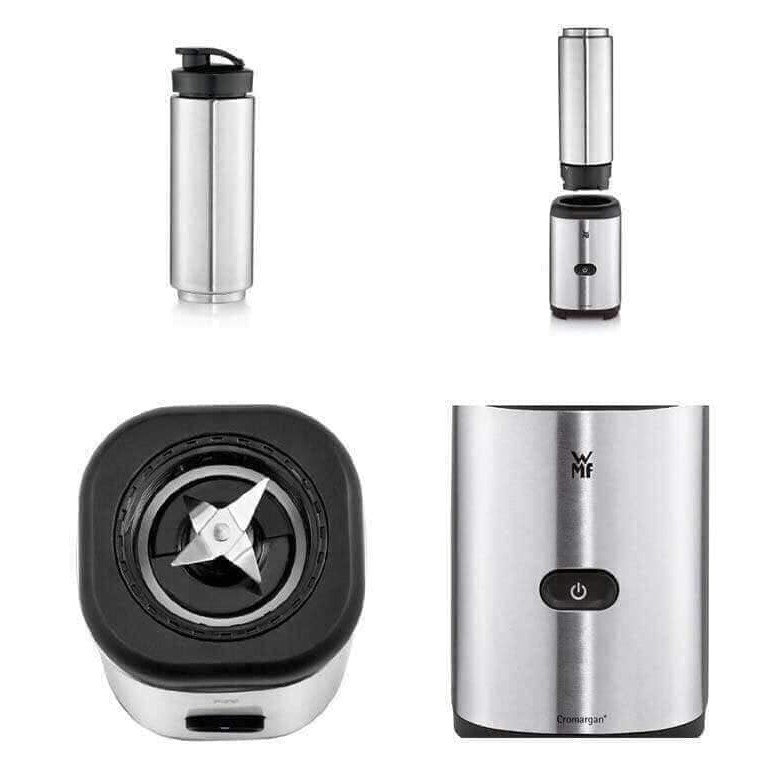 Máy xay smothie mini kèm bình đựng inox. Chỉ cần cho hoa quả vào xay, tháo ra, lắp nắp là có thể mang đi để uống rồi. Nhanh gọn tiện lợi - Máy xay sinh tố WMF với phần thân máy làm bằng chất liệu thép Cromargan® matt sáng bóng, sang trọng, bình 600ml Tritan BPA free (Hoặc bình inox giữ nhiệt) - Công suất 300W, dao xay 4 lưỡi bằng thép không gỉ có thể xay cả đá. - Chế độ an toàn: Chỉ quay khi được gắn bình.