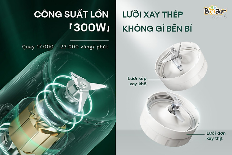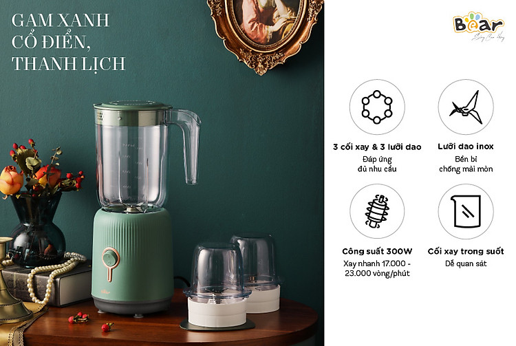 Máy xay 3 trong 1 đa năng Bear LLJ-C10P1 (BL-B10V2 - mã quốc tế) sở hữu thiết kế nhỏ gọn, tông màu xanh sang trọng, tích hợp đến 3 loại cối xay khác nhau giúp bạn vữa xay sinh tố, xay thịt và đồ khô nhanh chóng, tiện lợi.