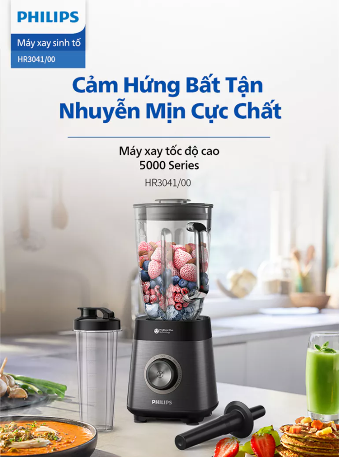 Công suất cao hơn 20%* làm đồ uống, xúp và nước xốt mịn từ ngay cả những nguyên liệu cứng nhất như trái cây đông lạnh, đá và các loại hạt.