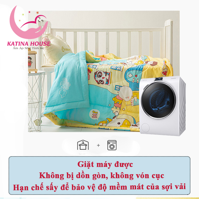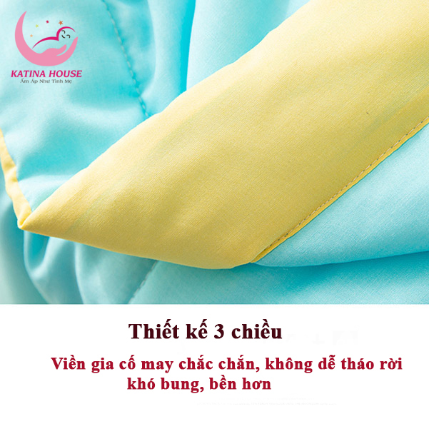 Bên trong mền cho bé được chần 1 lớp bông gòn nguyên miếng mỏng , siêu mịn, đảm bảo giặt máy không bị trôi hay vón cục bông.