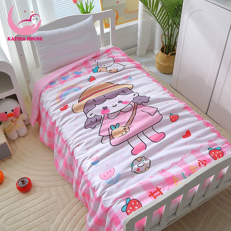 Chất liệu: lụa mềm, mền chần bông mỏng, nhẹ, mền mát mượt, sờ vào mướt tay. Có nhiều họa tiết siêu cưng đảm bảo các bé sẽ rất thích.