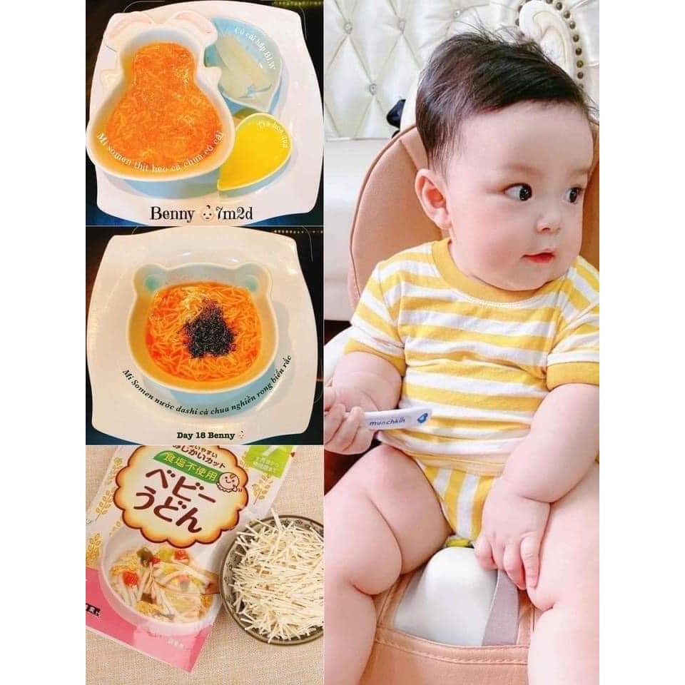 - Loại từ 5 tháng trở lên : sợi mì somen mềm nhuyễn thích hợp cho bé tập ăn. - Loại từ 7 tháng trở lên : sợi mì udon to hơn tí nhưng vẫn trơn mềm thích hợp cho bé ăn thô hơn. - Loại từ 9 tháng trở lên : sợi mì spaghetti dai và to bản hơn thích hợp cho bé xử lý thô tốt.