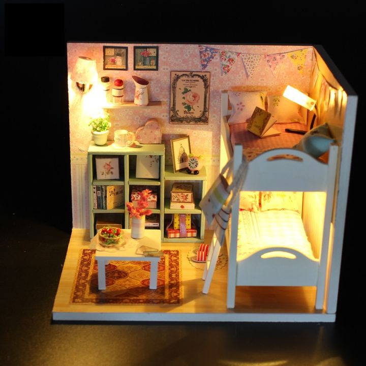 👉Nhà búp bê DIY là mô hình phòng ngủ trẻ em thu nhỏ với đầy đủ nội thất đáng yêu, như giường tủ hai tầng liên hoàn, gối, nệm, tủ kệ, giá sách, được trang trí với những món đồ như đồng hồ, lọ hoa, khung ảnh, đèn trang trí, thảm trải sàn, bếp, phòng khách.. Toàn bộ được phối gam màu gỗ chủ đạo,kết hợp cùng giấy dán tường trang trí họa tiết đáng yêu. Điểm nhấn cho căn phòng chính là hệ thống đèn LED mini chiếu sáng bằng pin độc đáo, tạo nên một không gian phòng ngủ ấm cúng, vô cùng sinh động và chân thực.