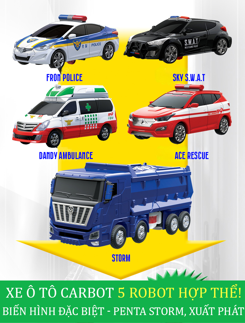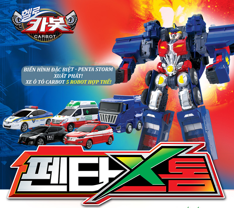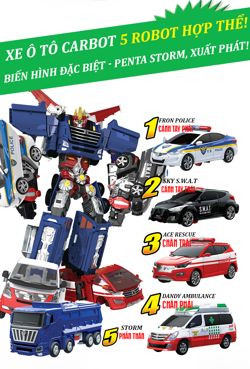 Đồ chơi HELLO CARBOT Penta Storm là sản phẩm thú vị dành cho các bé yêu thích xe biến hình. Robot Penta Storm biến hình từ sự kết hợp giữa 5 xe ô tô: Ace Rescue, Dandy Ambulance, Fron Police, Sky S.W.A.T và xe tải lớn Storm.