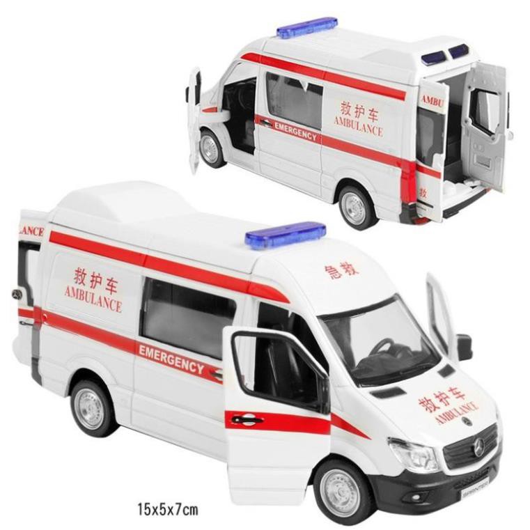 Mô hình xe cứu thương 1:32 UNK Đầu xe bằng hợp kim, thân xe bằng nhựa. Xe mở được cửa, nắp capo và cốp. Xe chạy đà, có đèn và âm thanh.
