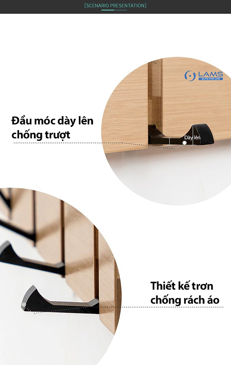 Mỗi thanh treo có 5 đầu móc treo bằng hợp kim nhôm được sơn tĩnh điện; thiết kế có gờ nhỏ đầu móc giữ quần áo không bị rơi, mỗi móc được phủ sơn bóng giúp bảo vệ quần áo khi treo không bị rách. Đầu móc với chất liệu hợp kim sơn tĩnh điện rất bền đẹp, chống trầy, chống gỉ sét